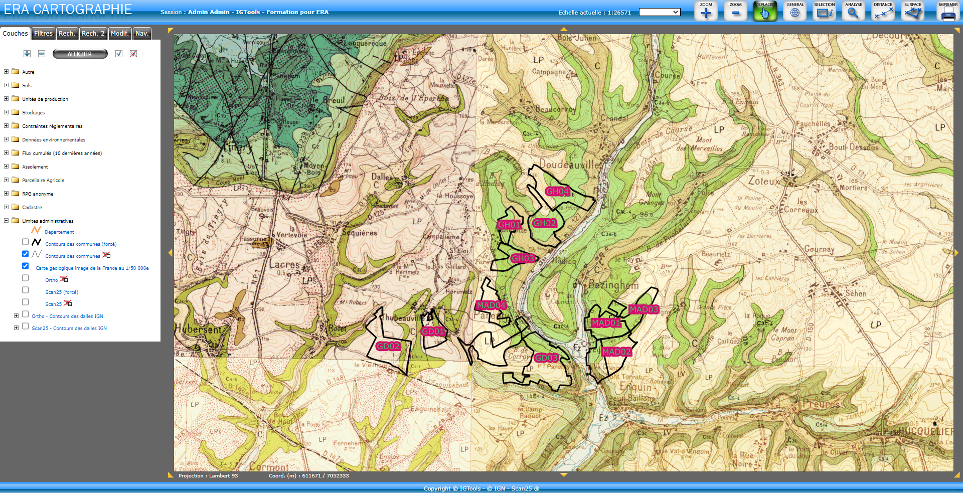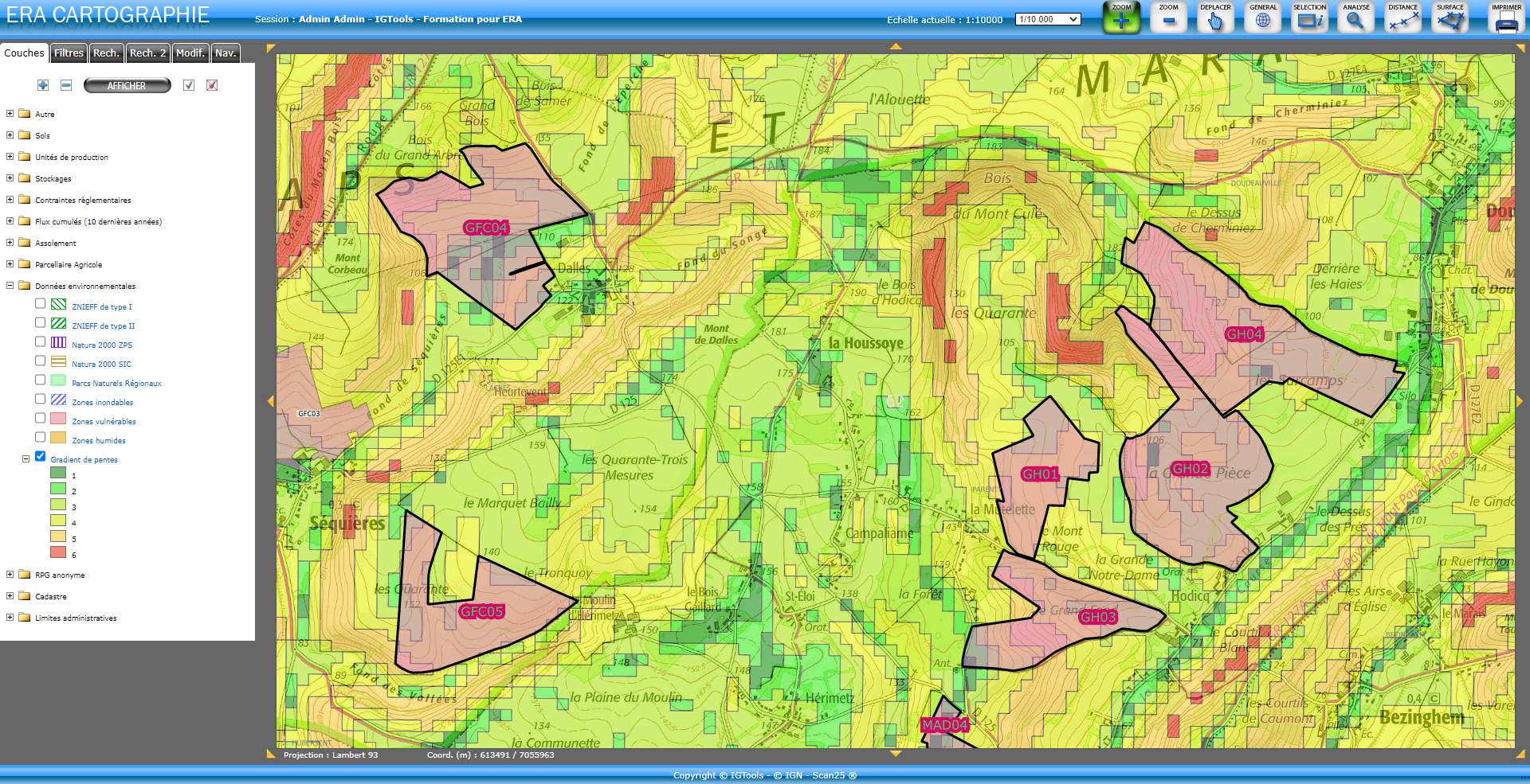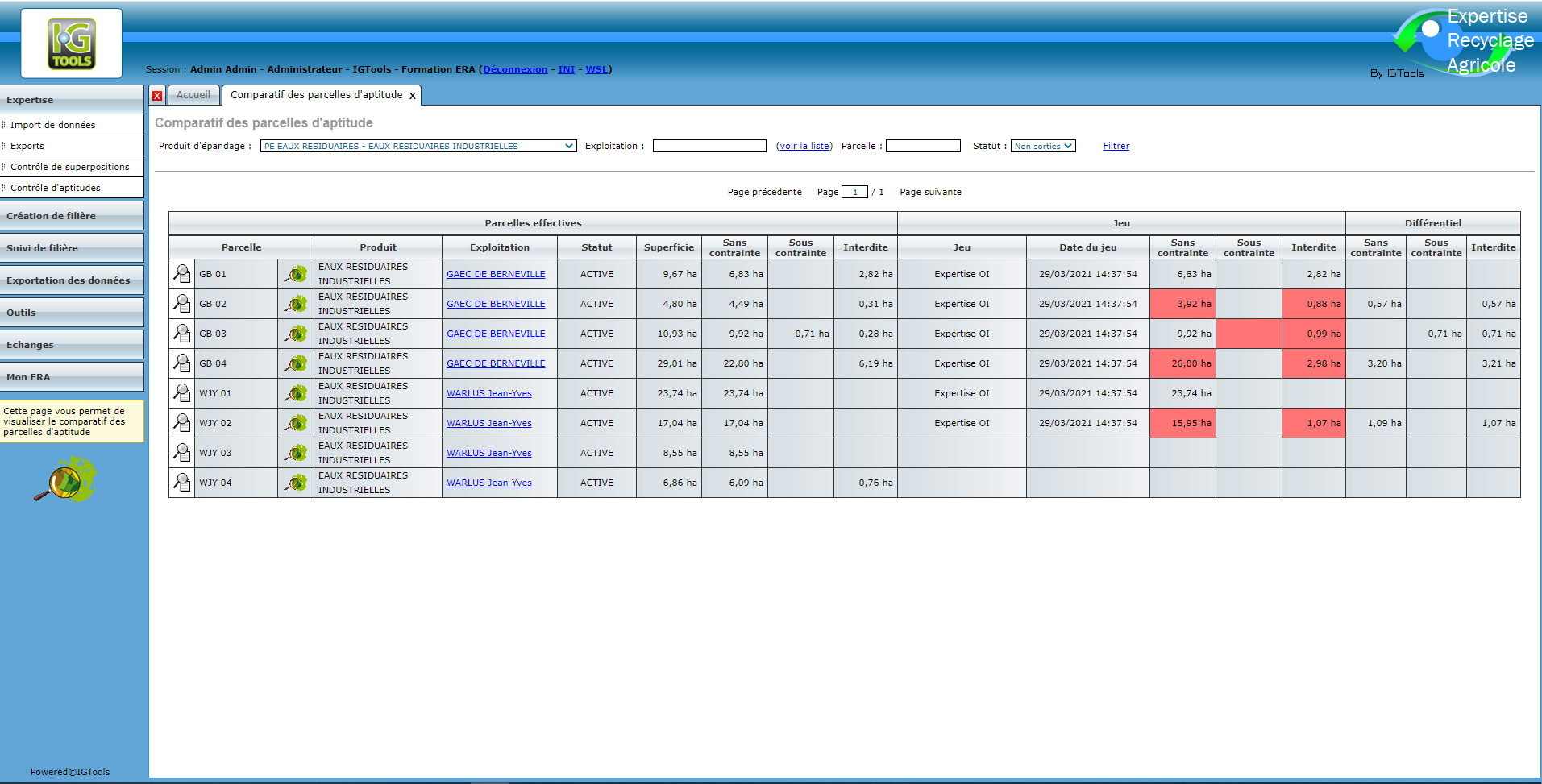Une fois votre plan d’épandage importé vous avez la possibilité de le visualiser dans les interfaces ERA, soit sous forme de données en tableau soit directement dans les interfaces cartographiques. Vous pouvez consulter vos agriculteurs du plan d’épandage, les parcelles mises à disposition, leurs aptitudes et aussi l’environnement global de votre plan d’épandage : La parcelle est-elle située dans une zone de vigilance environnementale renforcée, quels sont les types de sols prédominants en fonction de la géologie générale …. Vous pouvez ensuite renseigner vos commentaires, vos réserves à l’échelle de la parcelle et retrouver ces éléments lors de votre expertise annuelle.