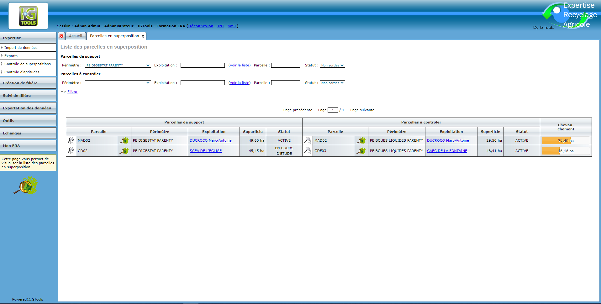 Une fois votre plan d’épandage importé, ERA dispose d’un assistant permettant de vérifier cartographiquement si les parcelles du plan d’épandage sont concernées par d’autres plans d’épandage de votre compte ERA. Des tableaux permettent de vous présenter les parcelles d’autres plans en superposition, ainsi que les chevauchements entre elles. Enfin des raccourcis en cartographie vous permettent de visualiser ces chevauchements et de compléter votre expertise.