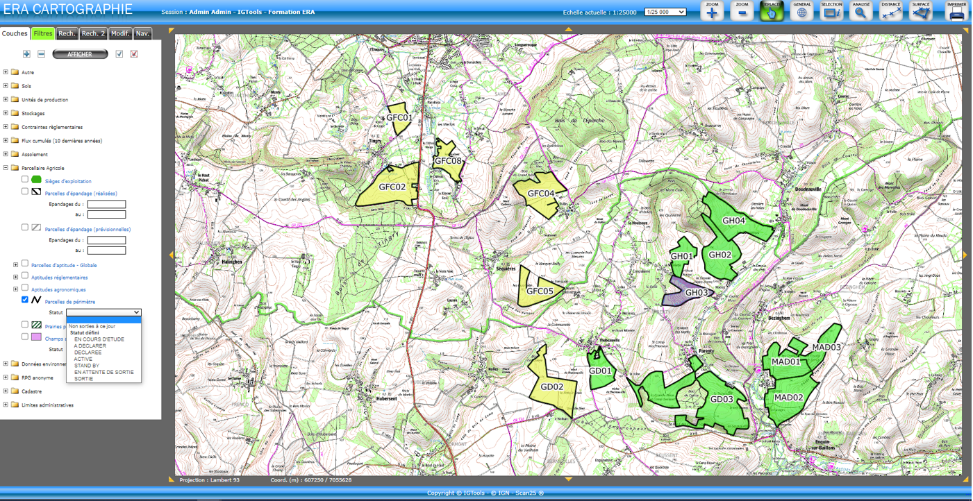 Avec ERA vous pouvez aussi suivre la vie de votre plan d’épandage. Une notion de statut permet d’indiquer si la parcelle en question existait dans l’arrêté de départ, quelles sont les parcelles qui sont éventuellement sorties depuis, et quelles sont les nouvelles parcelles entrées. Ces statuts sont ensuite utilisés dans les affichages en cartographie, dans la sélection des parcelles ou dans les tableaux récapitulatifs.